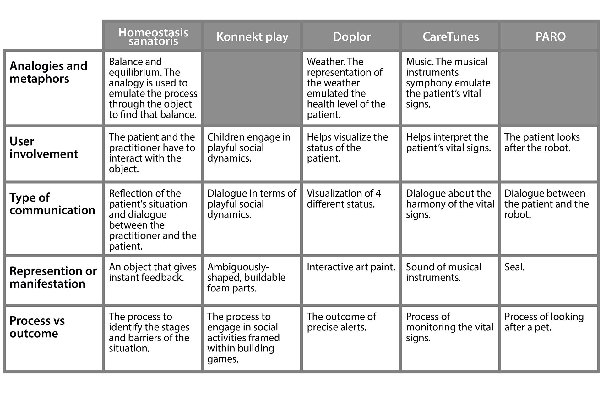 The purpose of the instruments described here is to determine other dimensions, such as the idea that patients remain human, despite their illness. Providing more interactions that resemble human behaviors can help avoid the alienation suffered during pathological processes, and we consider that through design, we can support such approaches by focusing design research on how to create opportunities to enrich such experiences.